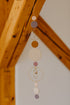 Zarte Punkte aus Polymer-Ton in Rosa, Lila, Cognac und Kalk fügen sich zu einem harmonischen Farbspiel, das Ruhe, Leichtigkeit und Natürlichkeit ausstrahlt. Feine Messingkreise fangen das Sonnenlicht ein, während der kleine Glaskristall es in funkelnde Reflexe verwandelt – ein sanftes Spiel von Licht, das den Raum belebt.